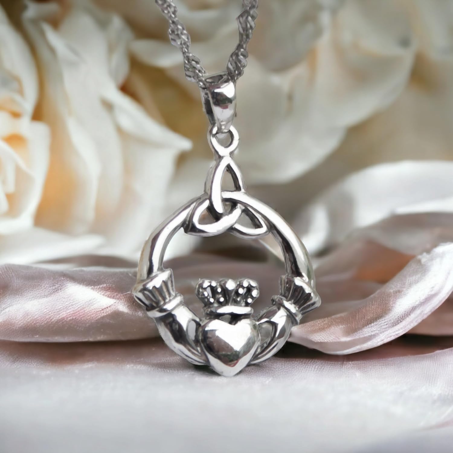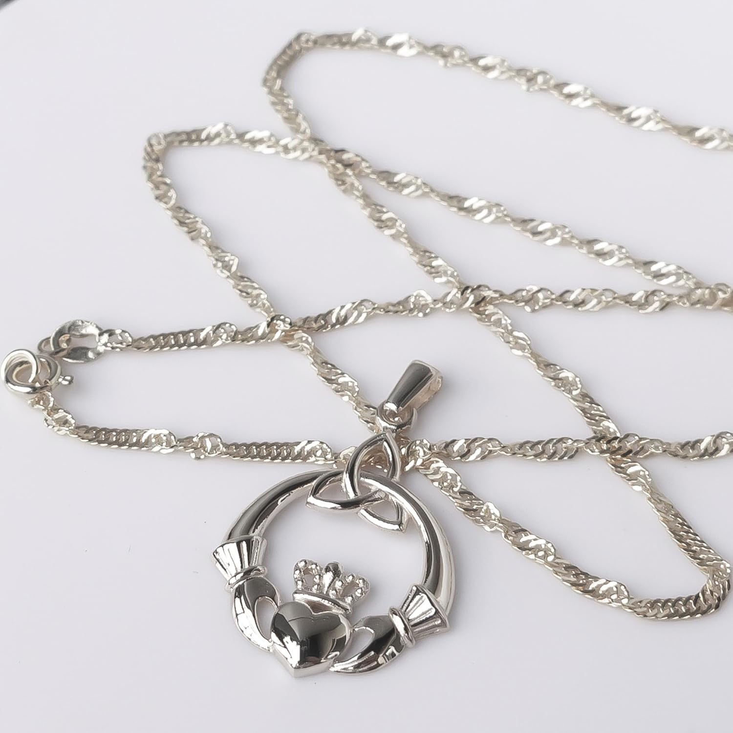 CLADDAGH NECKLACE. 925 STERLING SILVER JEWELRY. Claddagh is a classic Irish design that typically depicts two hands grasping a heart, with a crown surmounting them. The hands and heart are meant to symbolize friendship and love respectively, while the crown represents loyalty. The Trinity knot is also called the Triquetra and is one of the best-known symbols in Celtic culture. The Celtic Christian church used it to represent the Holy Trinity, but other cultures used the symbol too and each attached its own meaning to it. It can be used as a symbol of Ireland’s ancient culture. The endless intertwining curves can also be representative of eternal love. The Trinity knot can even be used to outline the stages of a woman’s life; youth, motherhood, and old age. As meaningful as it is beautiful, this is the perfect pendant to wear as a symbol of your devotion. This unique handmade pendant necklace can be a perfect gift with love for girls and women or mothers day gifts for mom