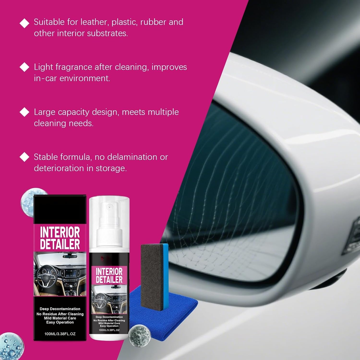 Our car interior cleaner is designed specifically for everyday car interior cleaning, aiming to provide car owners with a convenient and efficient cleaning experience.Product FeaturesThis cleaner features a user-friendly design, making it easy for even first-time users to use. Just three simple steps: Shake well before use to ensure even mixing; spray a small amount of cleaner onto the surface to be cleaned, ensuring the surface is pre-cleaned and free of impurities; gently wipe with a sponge to help remove dirt; finally, wipe dry with a towel for a clean finish.This product is suitable for all car interior materials, including leather, fabric, plastic, and other common interior surfaces, making it the ideal choice for cleaning your car. The gentle formula is suitable for daily use and helps keep your car interior clean and fresh for longer.Product dimensions: 4*4*14.9cm, Sponge: 3*1.5*7cm, Towel: 20*20cm
